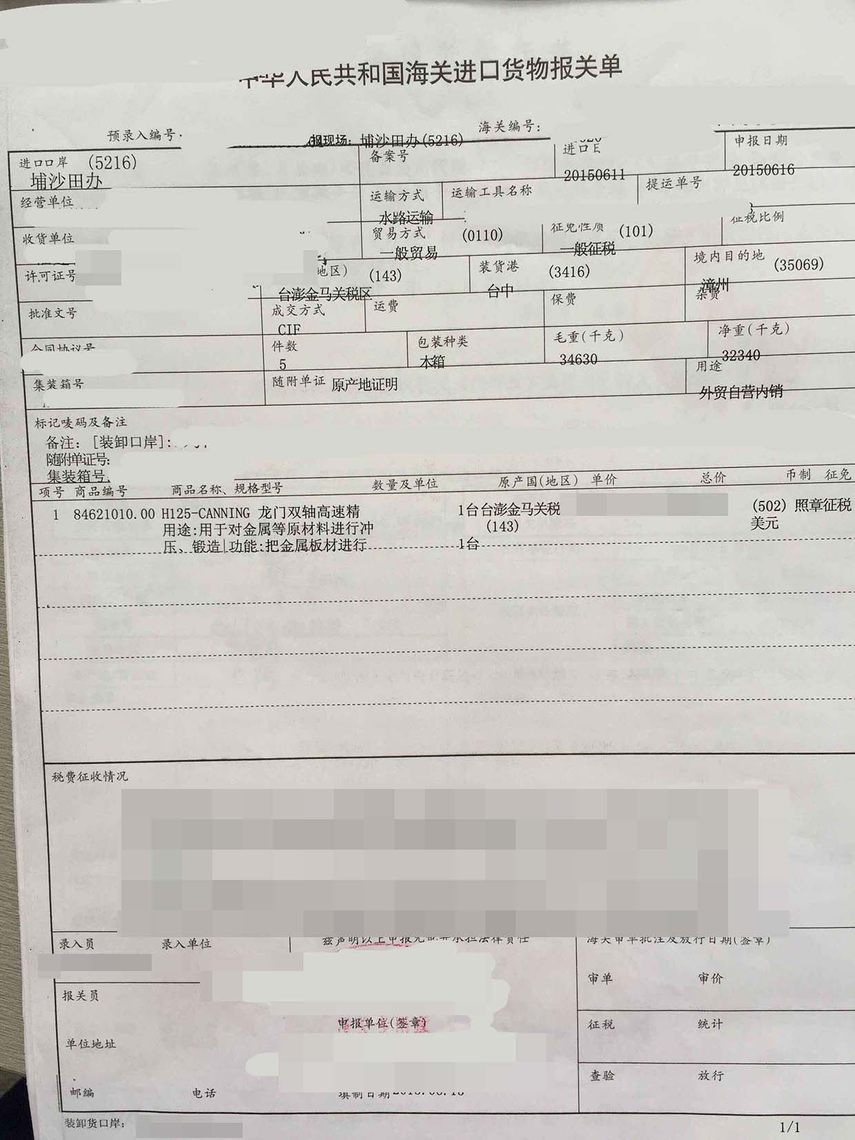 三、龍門雙軸高速精密沖床進口報關(guān)案例展示