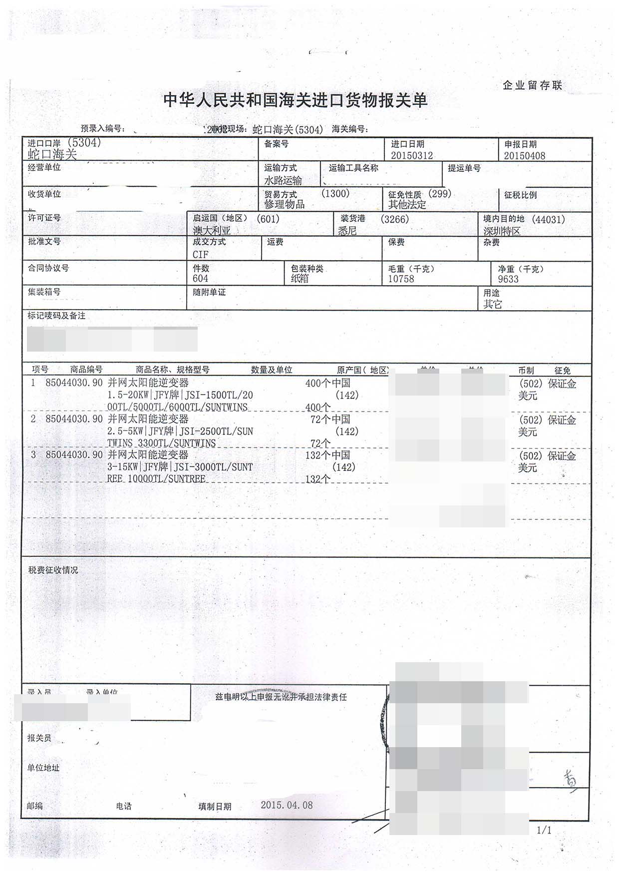 并網(wǎng)太陽能逆變器進口報關(guān)案例