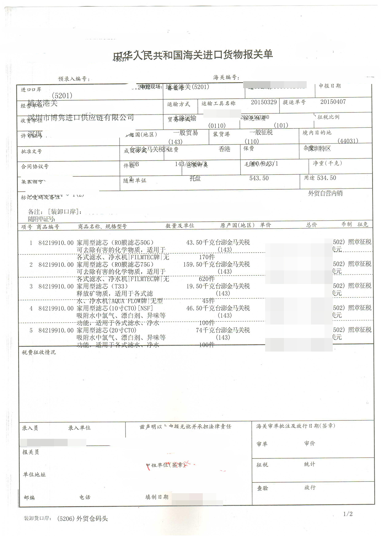 操作貨物:家用型濾芯(RO膜濾芯50G)等