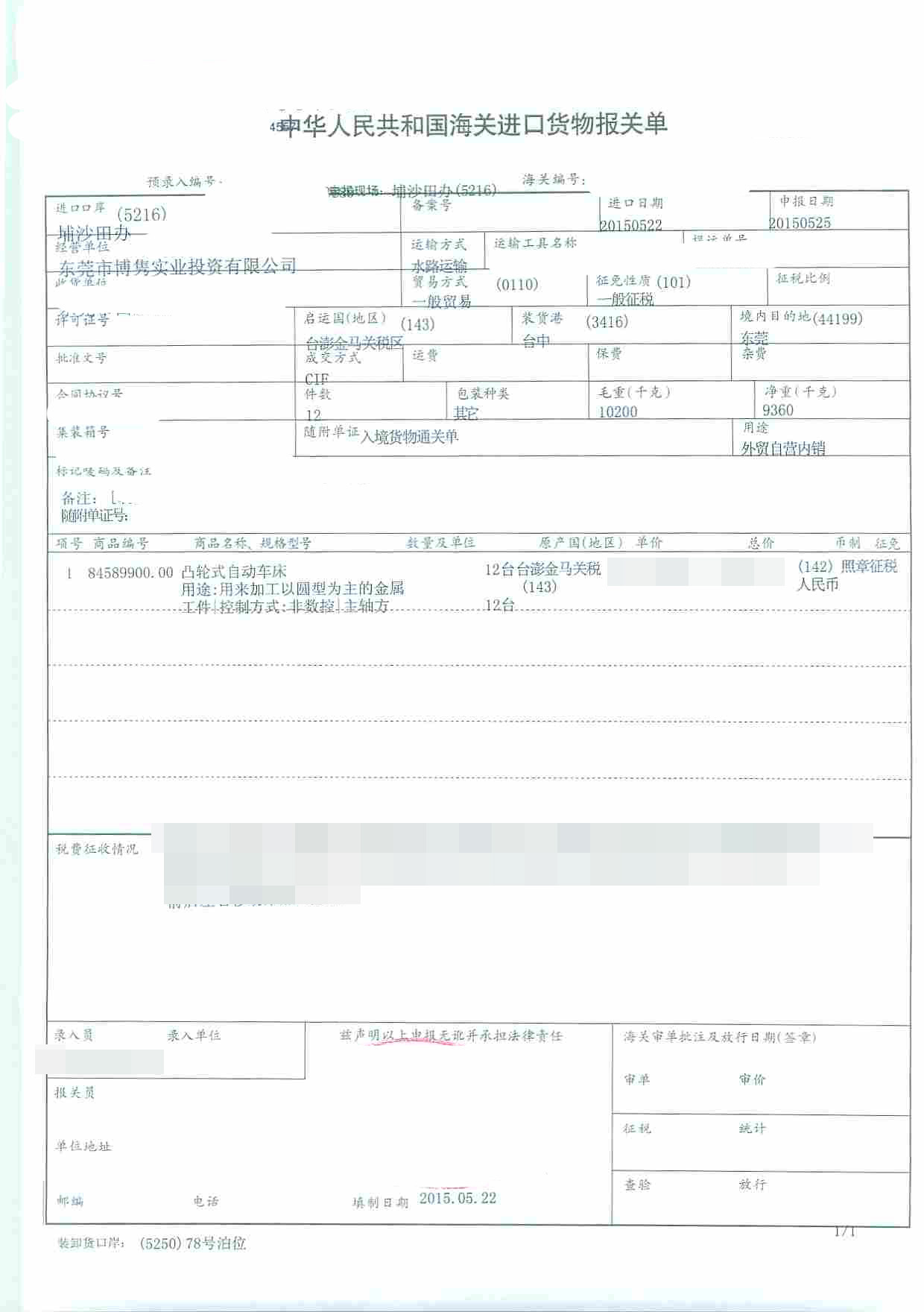 進口口岸:黃埔海關駐沙田辦事處(埔沙田辦)