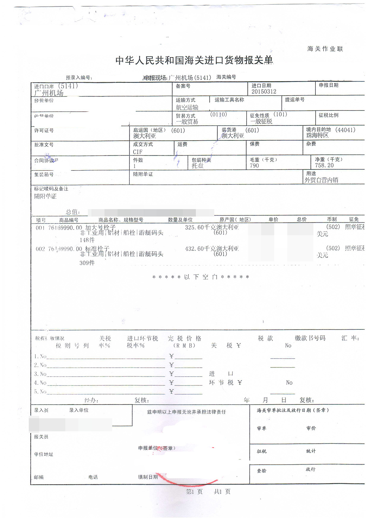 進(jìn)口日期:20150312客戶:珠海某游艇服務(wù)有限公司