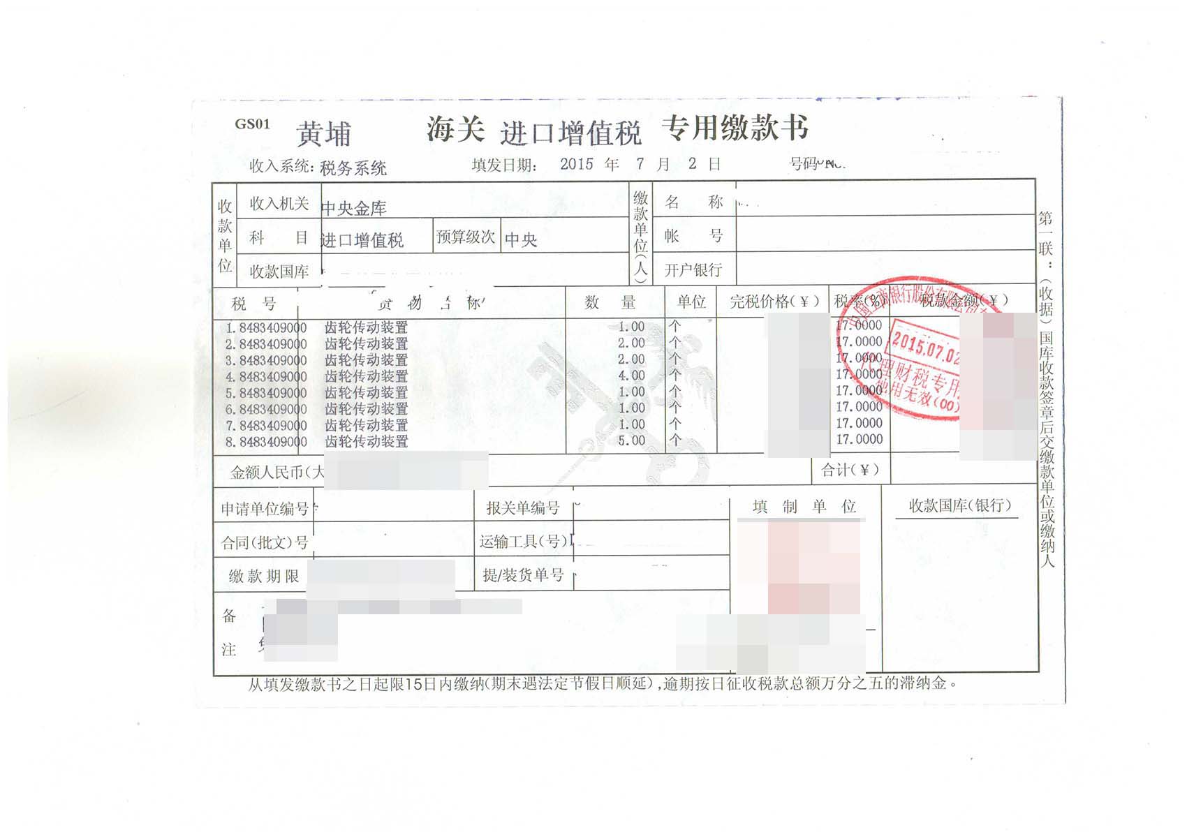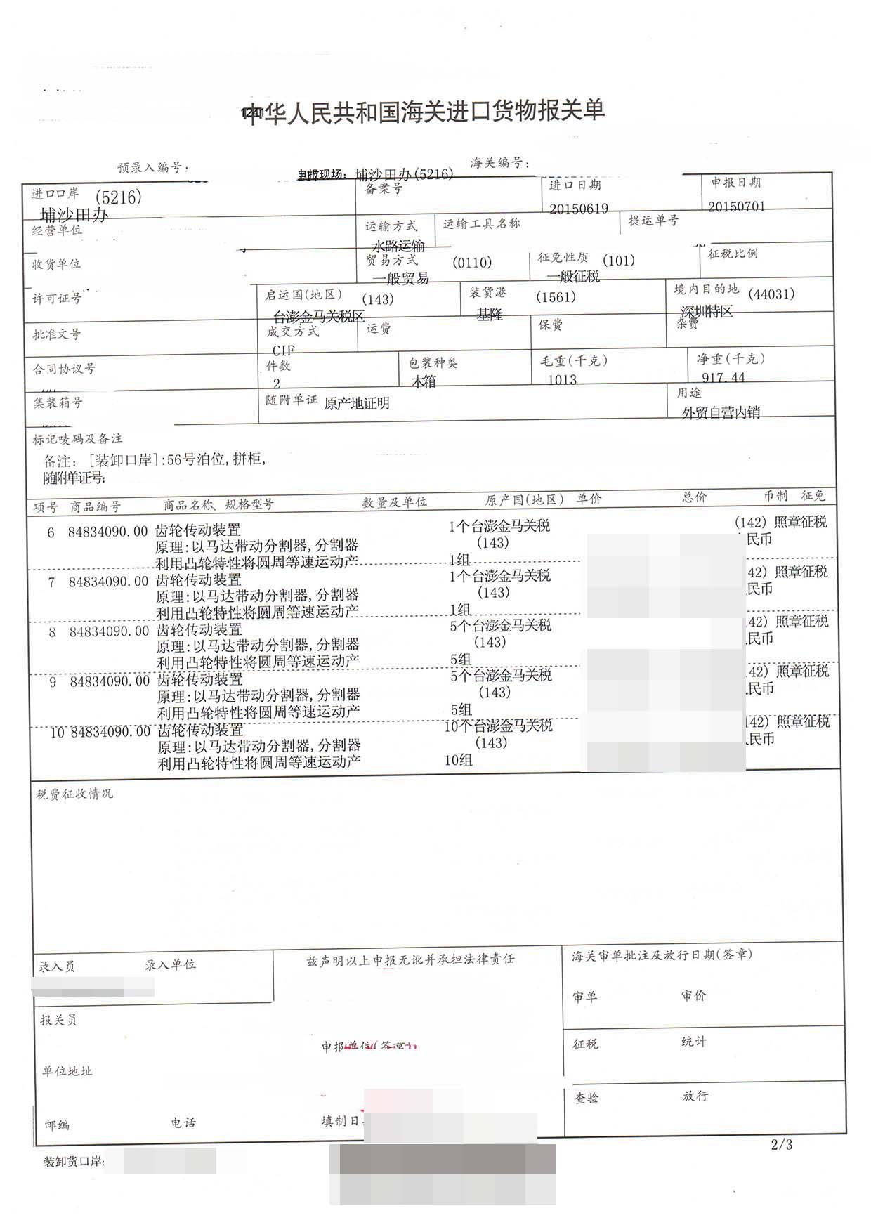 三、齒輪傳動裝置進(jìn)口報關(guān)案例展示