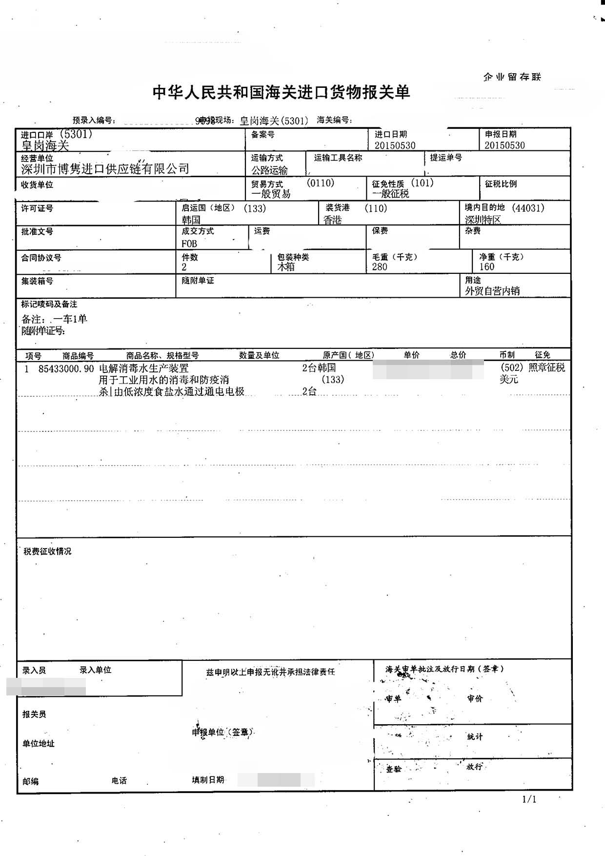 三、電解消毒水生產(chǎn)裝置進(jìn)口報關(guān)案例展示