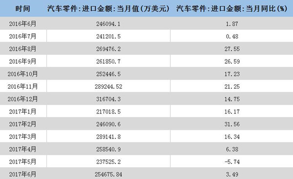 博裕機械進口報關行獲悉,2017年6月我國汽車零件進口金額達25.47億美元,當月同比增長3.49%;累計進口金額達150.32億美元,累計同比增長10.2%。