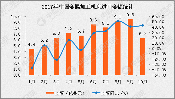 2017年10月中國金屬加工機(jī)床進(jìn)口金額6.3億美元,同比增長43.1%。1-10月,中國金屬加工機(jī)床進(jìn)口金額達(dá)71.4億美元,同比增長13.1個(gè)百分點(diǎn)。