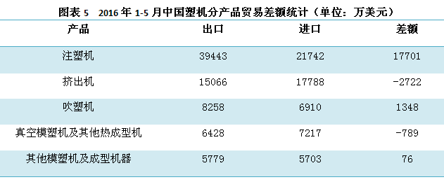 圖表5的統(tǒng)計數(shù)據(jù)表明,2016年1-5月中國塑機的五大類產(chǎn)品進出口貿(mào)易中,注塑機、吹塑機、其他模塑機及成型機器等三大類產(chǎn)品均為貿(mào)易順差,擠出機、真空模塑機及其他熱成型機兩大類產(chǎn)品則為貿(mào)易逆差。