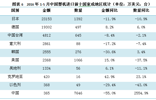 圖表6的數(shù)據(jù)表明,2016年1-5月,中國塑機進口前十國中僅有德國、美國、奧地利、克羅地亞等4個國家保持了較大的同比增長,其余六個國家均有大 幅度的減少。日本同比下降11.9%,而在2015年的1-5月份日本的進口金額超過了25000萬美元,且同比增長21.0%。德國增長8.2%,但去 年德國的表現(xiàn)為17843萬美元,金額同比是下降31.2%。