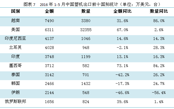 越南成為中國塑機最大進口來源國,且同比有大幅度的增長。美國、土耳其、印度、墨西哥和俄羅斯聯(lián)邦等五個國家也分別有不同程度的增長,其中美國增幅高 達 58.2%。印尼、泰國、伊朗、韓國等四個國家出口金額同比則有大幅度的下降,其中泰國的下降幅度達到51.9%。和泰國同樣情況的還有伊朗,2016年 的前5個月中,每個月都比去年同期相比均有下降,1-5月整體下降了46.6%。