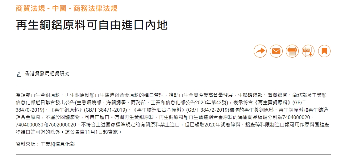 香港再生銅鋁原料可自由進(jìn)口到大陸
